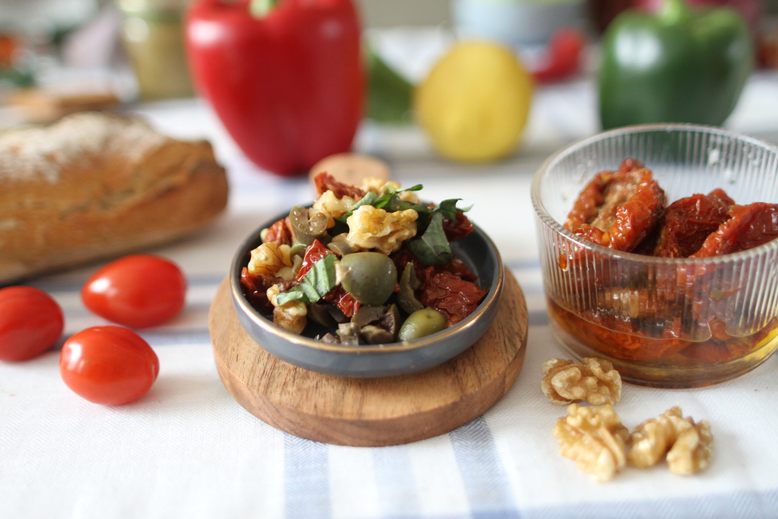 Un mariage ensoleillé de tomates séchées, noix et olives.